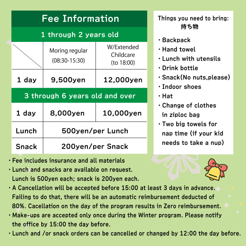 3歳から6歳(それ以上) 1日8,000円(08:30~15:30)ほか