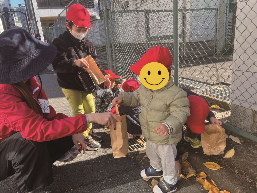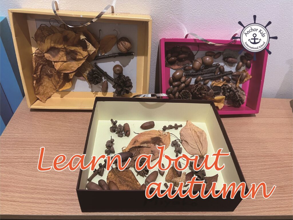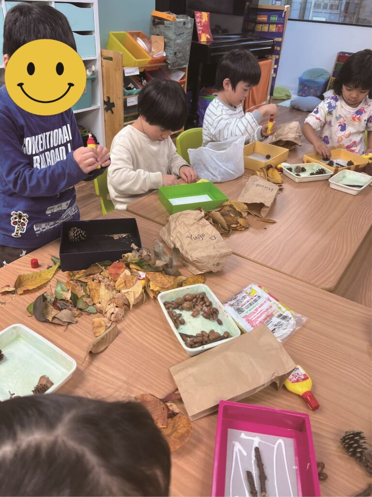 Because the air had gotten colder at the beginning of the week, we decided to learn about the “signs of autumn”. First we read a book about autumn and then we went outside to look for colorful leaves and other signs of autumn. The students found many colored leaves. We made a collage with them and with acorns which we had picked up during our last tabiiku. The children made a beautiful collage. They also made an acorn maze with cardboard boxes, and Whale class students sorted many acorns by kind. (くぬぎ、しい、など)