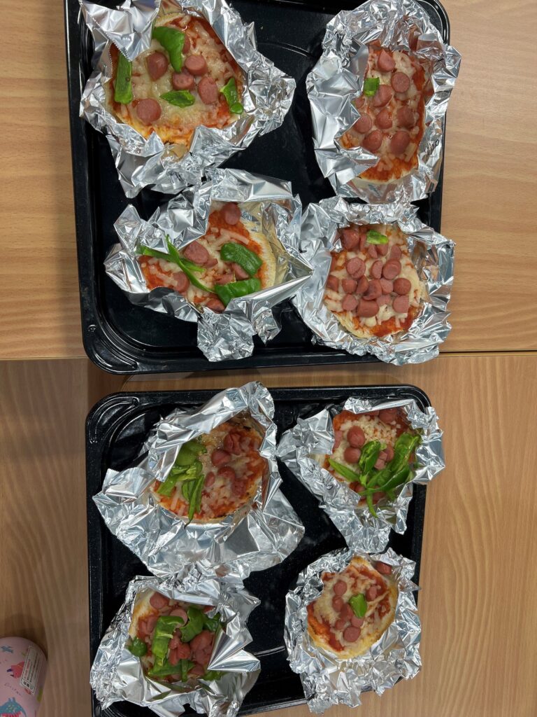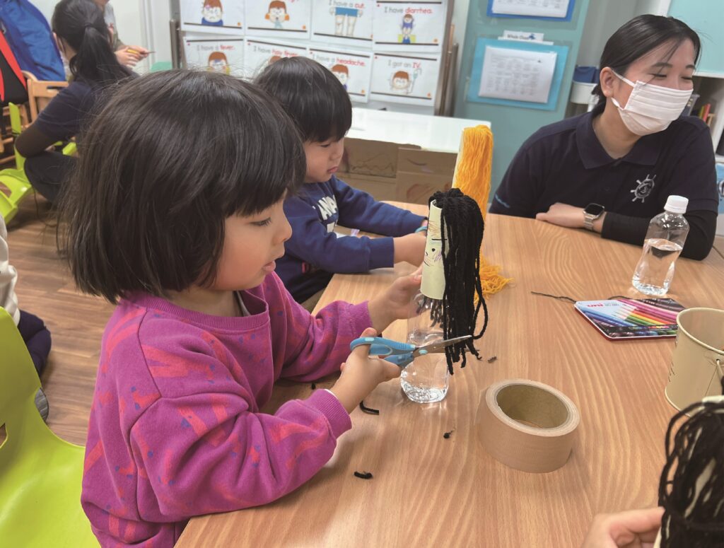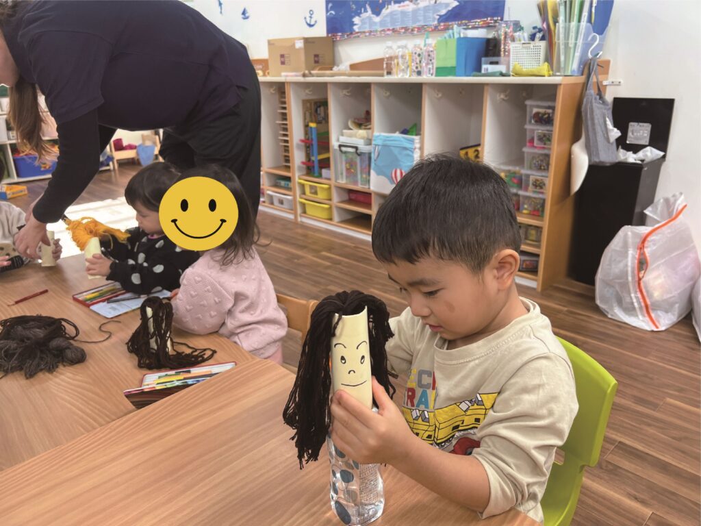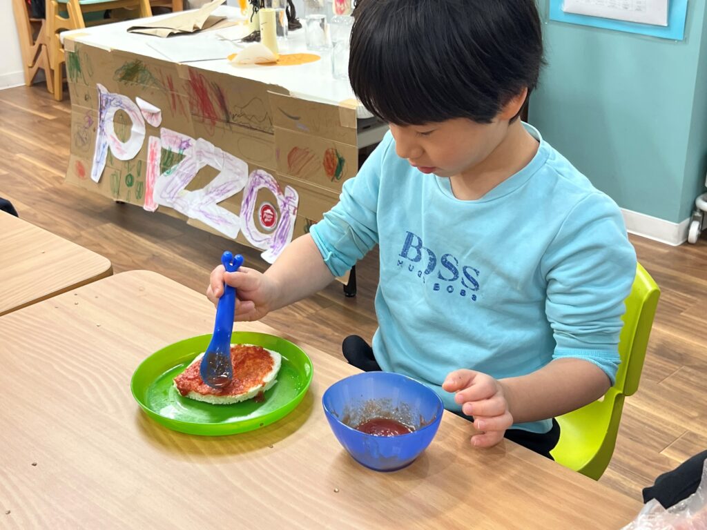 Throughout the week, the children continued to learn about many kinds of occupations. The pizza shop was open almost every day, and additionally, this week a hair salon was opened because one of our students brought her toy makeup set in the morning. We applied makeup onto paper faces, and then cut and put hair ties on yarn hair. For the younger students, it was difficult to cut the yarn hair but they did not give up and kept cutting for a long time. On Friday, we opened a real pizza shop and cooked our own pizza. We spread tomato sauce on the crust and chose toppings (cheese, green pepper, and sausage). Everyone ate a lot!