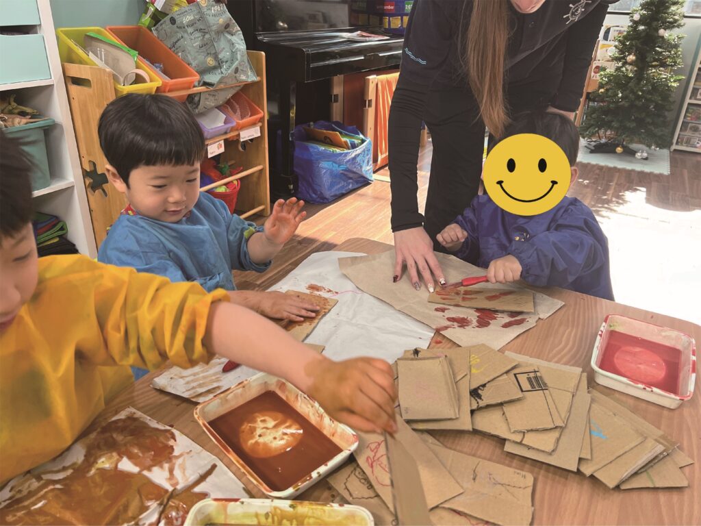 Last week our students began preparing for our December special event… Christmas! They have started talking about what presents they want or have already asked for from Santa. Of course we began making a fireplace (because it’s very important to have one for Santa so that he can deliver presents). We each made bricks for the fireplace. Then each student made their own Christmas stocking, and we all also made Christmas decorations.