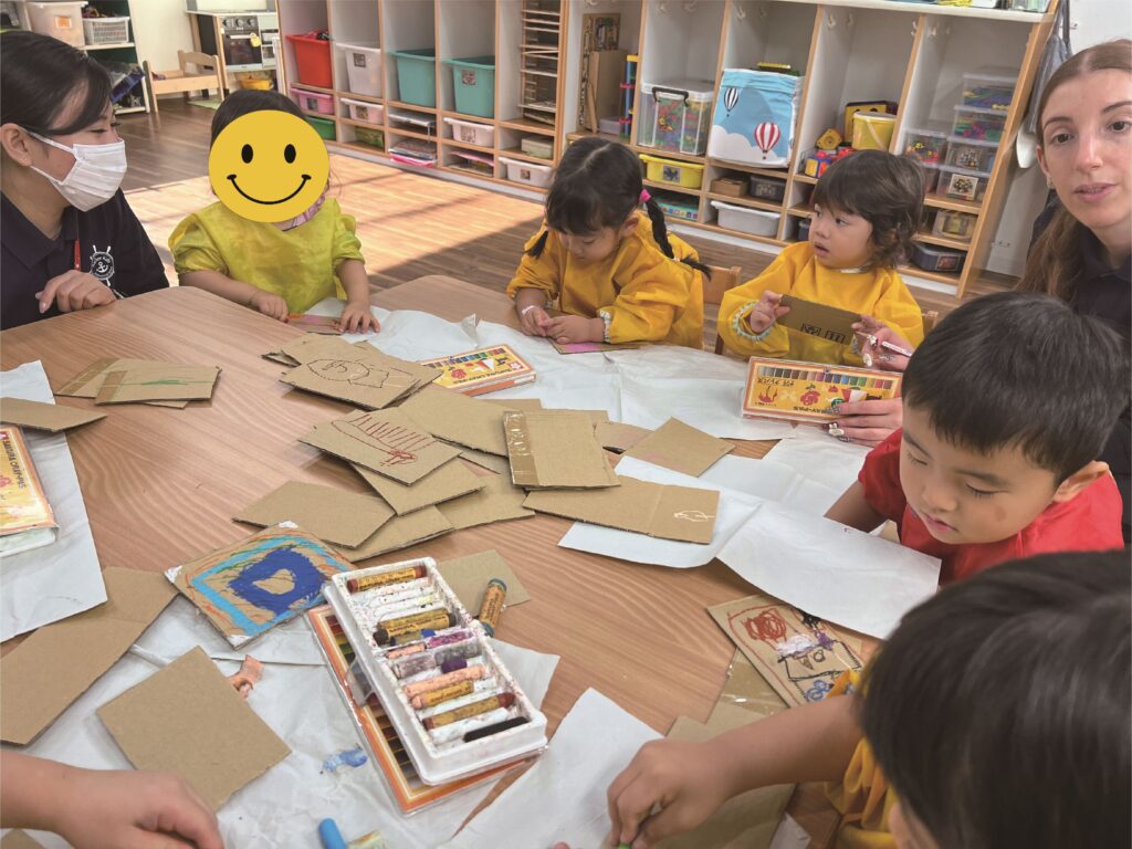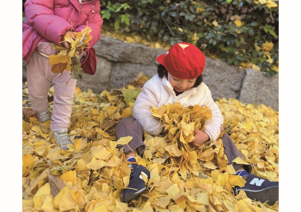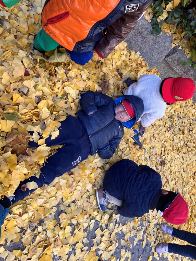 The air has been getting colder, but we could go to the park almost everyday this week. Even though we are preparing for Christmas, at the park we could still see full “fall” scenery. We ran through falling gingko leaves, catching them as they fell like snowflakes. Then we found a big pile of leaves. The children could almost “swim” in that mountain of leaves. We enjoyed the beauty and joys of the fall season this week.