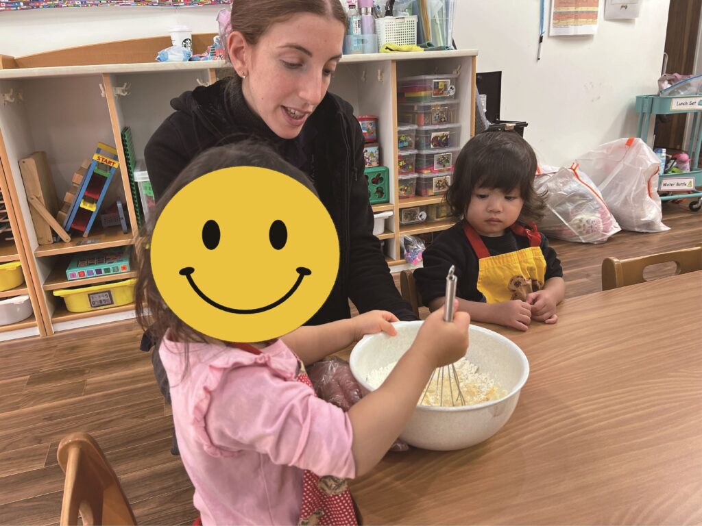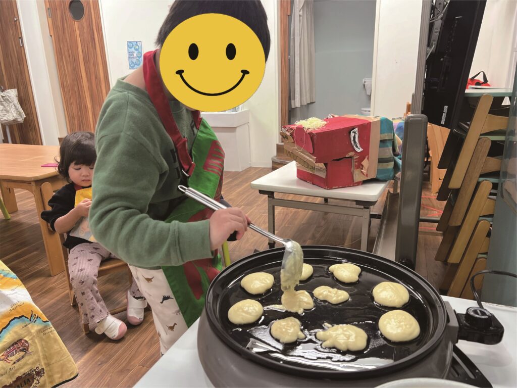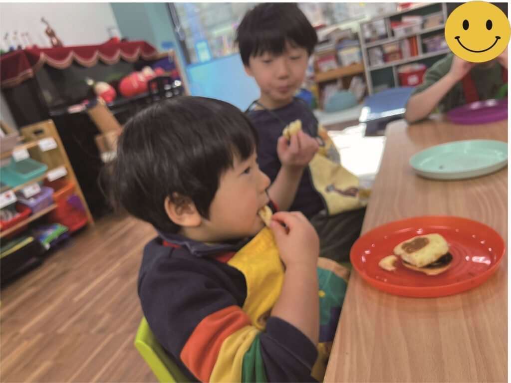 Then on Friday we cooked “dorayaki”! They mixed flour, eggs, and milk to make two pancakes, and then put anko (sweet bean paste) between them. They enjoyed making and eating them a lot, of course!