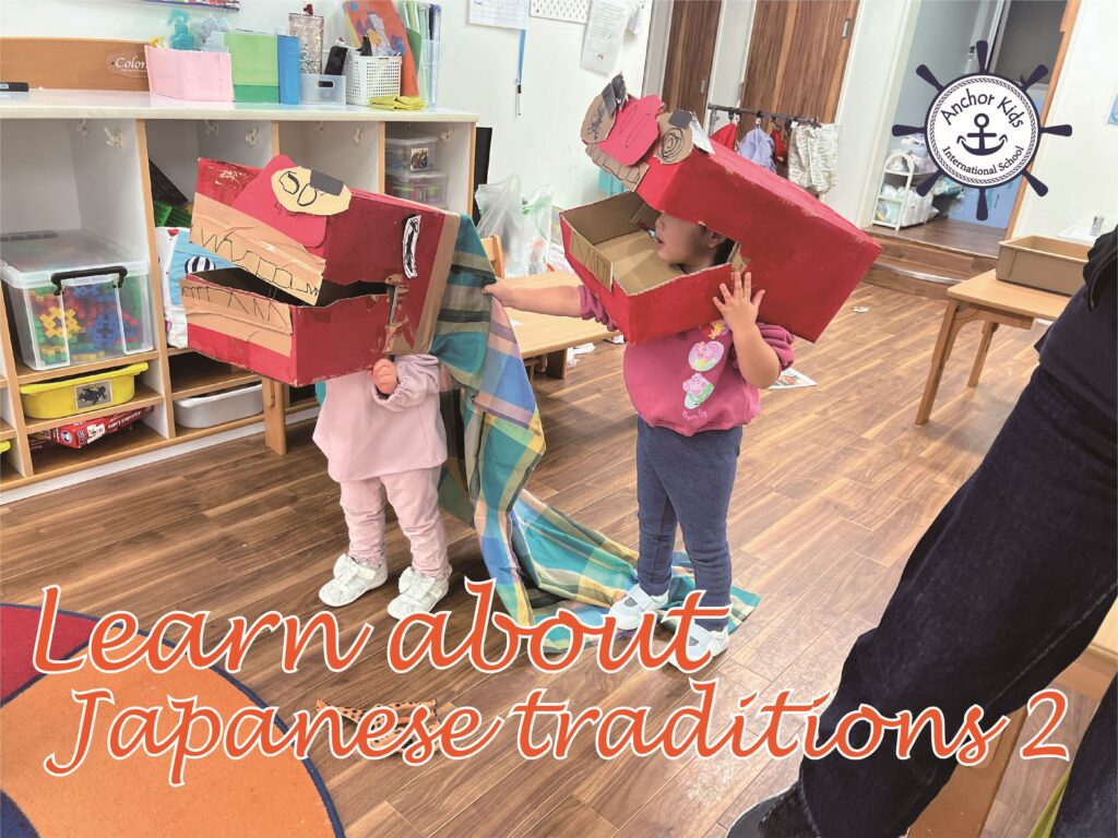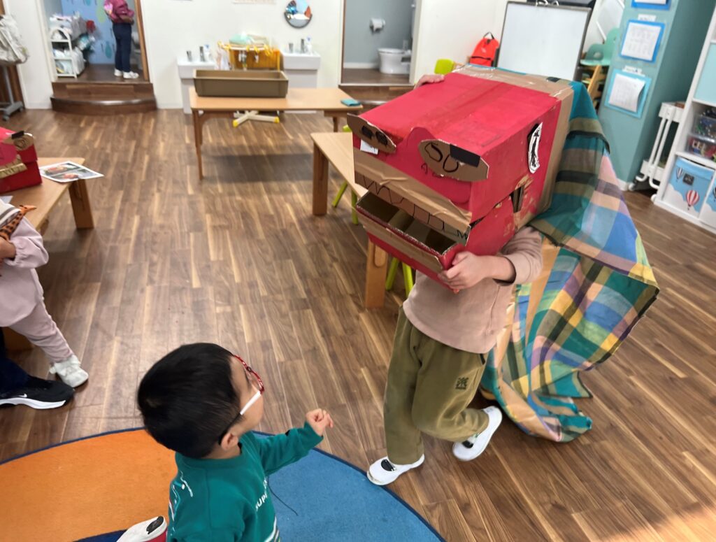 They painted two boxes in red, and added a nose, eyes, teeth, etc, to make a “shishimai”. Some of the students remembered that being bitten by a shishimai brings good luck, so as soon as they finished making their shishimai, they put them on to bite each other… Also, the younger students tried to feed the shishimai toy food from our play kitchen!?!