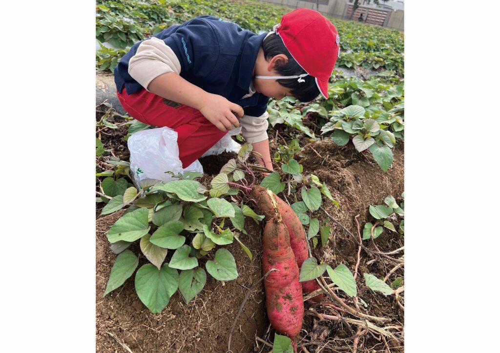 When the farmer explained how to dig up the sweet potatoes they listened very carefully, and they tried so hard to find sweet potatoes and pull them up. At first, some of the children touched the ground with just the tips of their fingers (so as not to get dirty…) but they soon realized that they can’t harvest a sweet potato that way. So they used their whole hands and all their power to pull them up. Although the farmer said that this year’s sweet potatoes are very thin because the summer was so hot, we harvested many sweet potatoes.